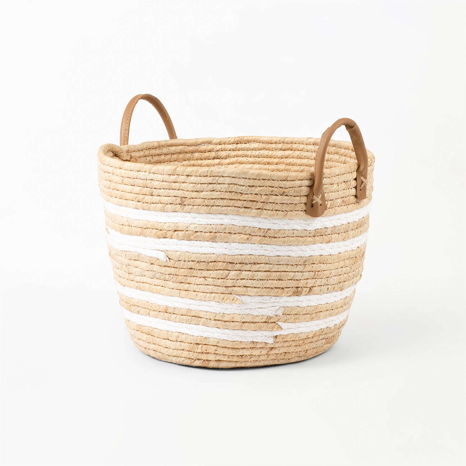 Add a touch of natural warmth to your home decor with our White Stripe Natural Woven Basket with Leather Handle.
